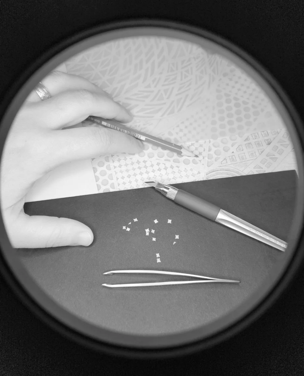 The design is then transferred to mulberry paper, otherwise known as Shoji paper or Hanji. It has beautiful natural fiber inclusions which is enhanced by the translucent or semi-translucent nature of the paper. Each shape is cut from the paper by hand. I use a magnifying glass to help with this fine detail.